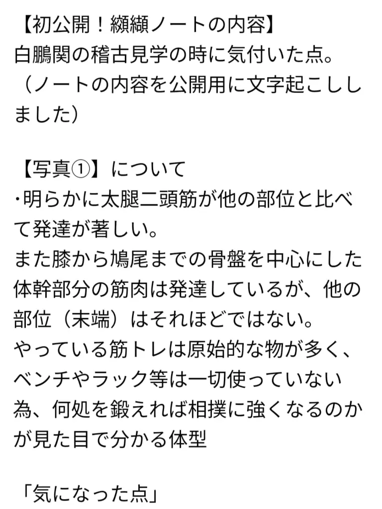 そんな事がわかる、纐纈が白鵬関の稽古を見て得た学びをまとめたノートの文章約4500文字程度をご覧頂けます。